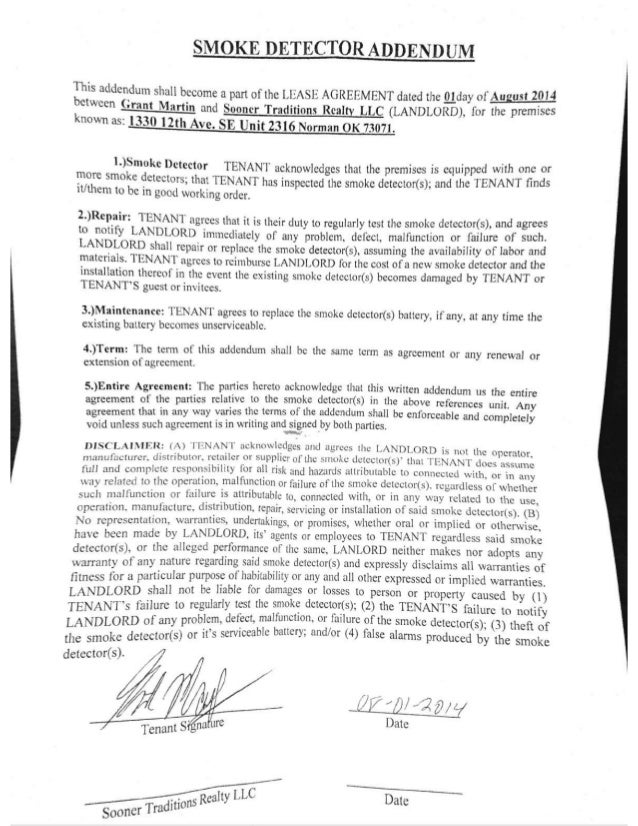 The parties acknowledge and agree that this addendum once signed shall be a part of the above mentioned lease, and that no other agreements concerning. What is a smoke detector? Owner/agent shall not be required to take steps unless owner/agent has actual knowledge or has been given written notice. Tenant(s) acknowledges the smoke and carbon monoxide detectors were tested; Smoke alarms, fire alarm systems, and fire sprinklers.