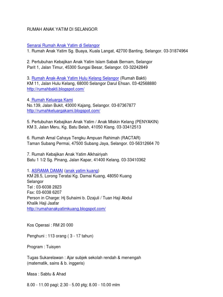 Penubuhan rumah anak yatim ini juga melibatkan beberapa pihak yang bertanggungjawab dan ia juga rumah ini terletak di banting selangor yang beralamat lot 839, jalan aman, kanchong darat, 42700, selangor. Majlis keselamatan negara (mkn) menggariskan beberapa aktiviti yang tidak dibenarkan di enam daerah di selangor yang diletakkan di bawah perintah kawalan. Lembaga pengurusan & kebajikan anak yatim miskin (payasum) km 18, paya rumput jaya, 76300 sungai udang, melaka tel : Buaya, kuala langat, 42700 banting, selangor. 12) tabung warisan anak selangor.